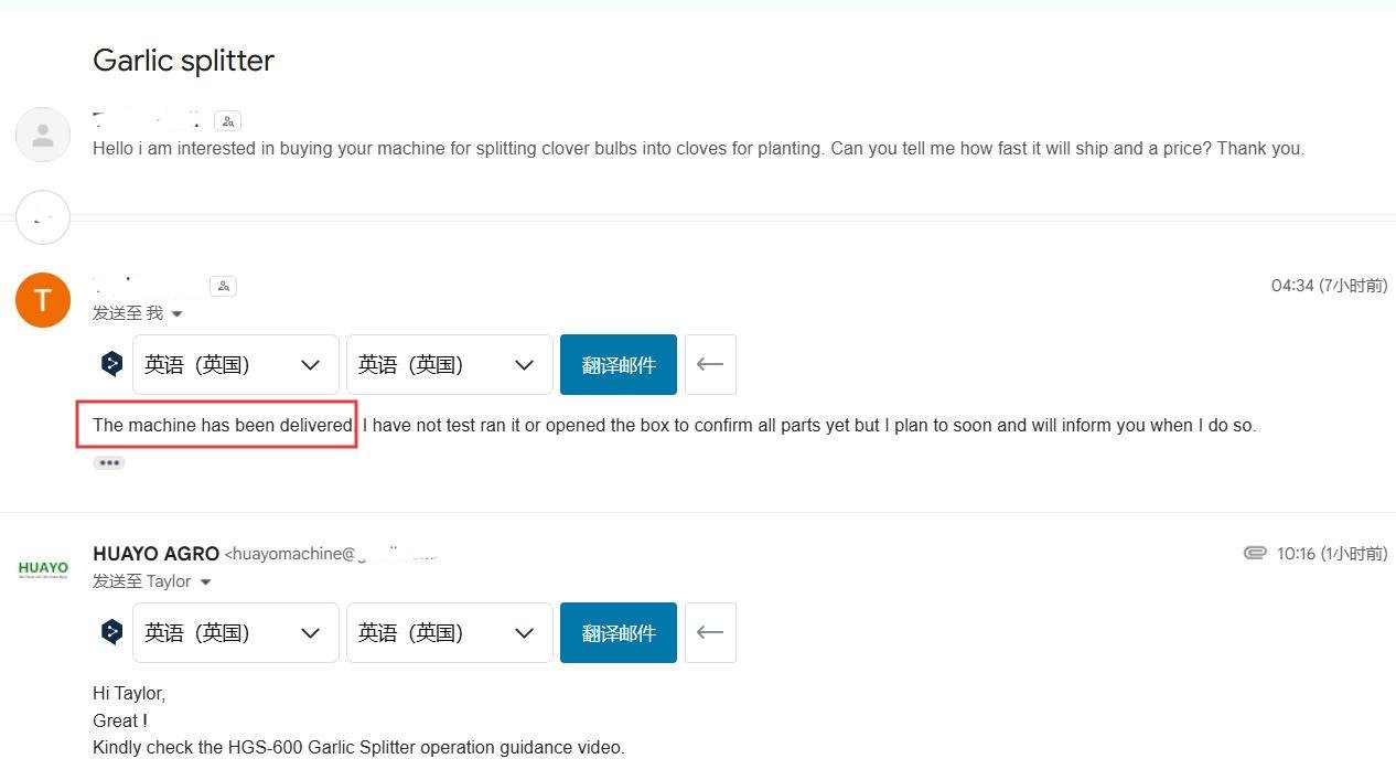 ” The HGS-600 Garlic Splitter has been delivered to my address today”
