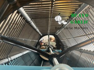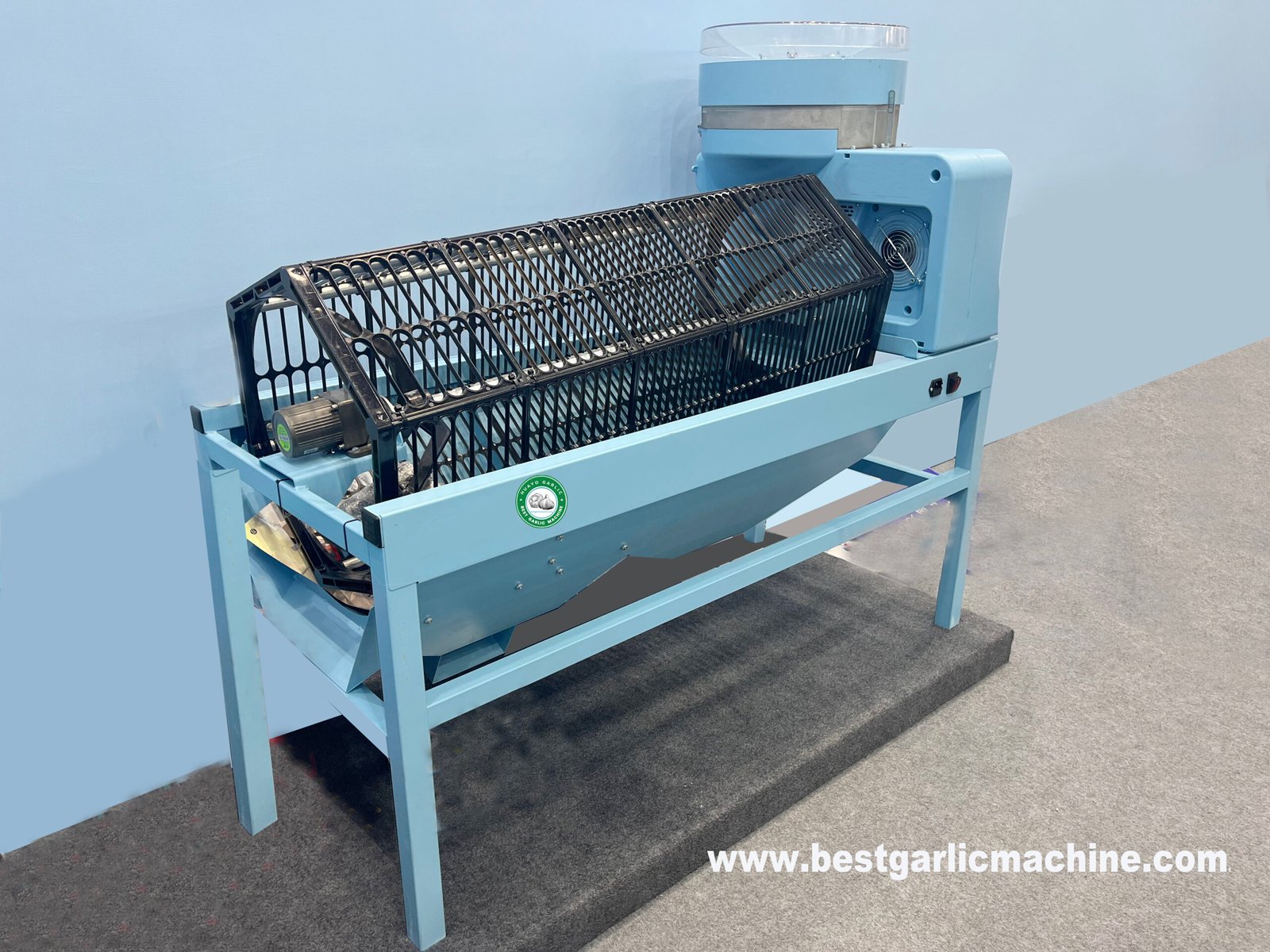 Then The garlic stems and garlic heads are blown away from the machine from one side , by the built-in fan and can be recycled. Finally, The separated garlic cloves roll out to the clove sorting machine. which will rotate and sort them with 3 sizes.